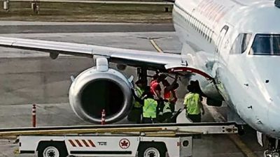 ■沙斯卡通国际机场的加航工作人员,正努力在机上寻找浣熊。
